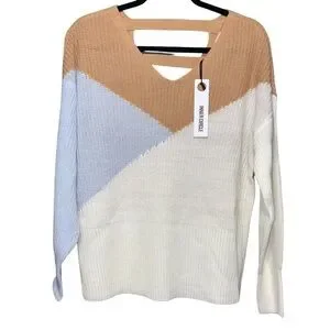 This modern V-neck sweater features a striking colorblock design in tan and blue, offering a lightweight knit perfect for layering. The geometric pattern adds a touch of sophistication to any casual ensemble. The back design adds a touch of style.