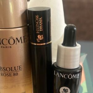 Bundle includes Lancome Cream radiance cleansing, tonique comfort toner, Eye make up remover, travel size dark circle correcting cream, creme, travel size xl mascara, make up bag and a few extras (see pictures)