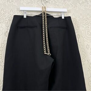 Straight cut wool pant featuring a suspended waist chain. Gold chain wraps around waist & is adjustable at back. Cinch in or release to have a longer drape of the chain. Wear with a shirt tucked in, or style with a cropped top to expose the skin.