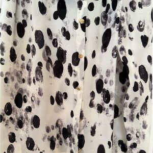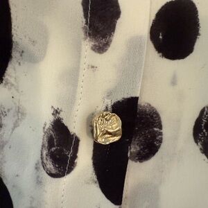 This Escada blouse features a striking cream and black color palette with a playful tie front design. The blouse's flowing sleeves and elegant style make it a standout piece for any occasion. Its unique pattern adds a touch of sophistication and flair to your wardrobe.