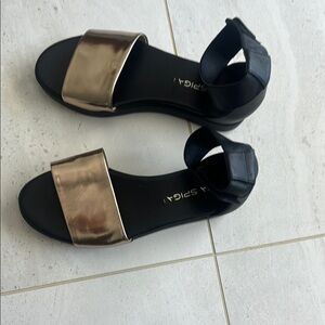 Step out in style with these elegant Via Spiga sandals. Featuring a chic black and gold design, these shoes are perfect for any occasion.