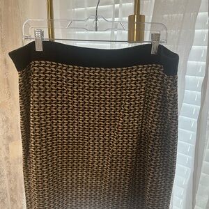 This Ann Taylor sweater skirt features a sophisticated brown and cream geometric pattern, perfect for both work and cocktail occasions. Measurements: waist- 18 inches length-21 inches.