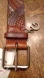 Belt is brown with various colored strips of snakeskin (?) running through belt.