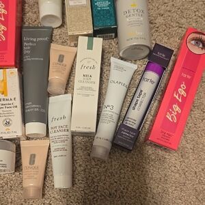 Diverse collection of skincare and makeup products. Includes creams, serums, and more. Comes with a shiny rose gold pouch and brown ulta bag. 40 pieces from tarte, clinique, fresh, osea and more! all new.