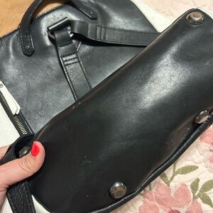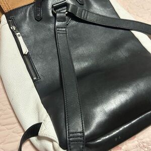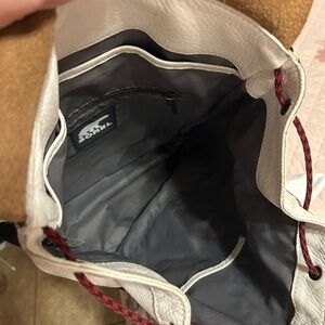 Stylish Sorel backpack in black and tan leather. Features a unique design with red accents.