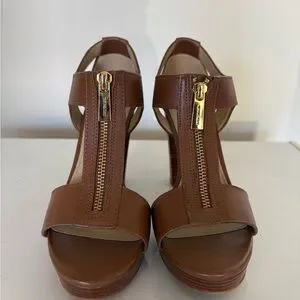 Step out in style with these elegant brown leather sandals. Perfect for any occasion, these shoes offer both comfort and sophistication. Michael kors zip up leather platform heels in a brown color.