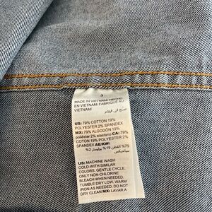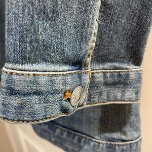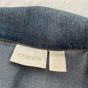 Chico’s denim jacket features a classic design with 2% Spandex for an amazing comfortable fit. Chico’s Size 3, 16/XL. Made of lightweight slightly washed out denim. Metal Closures have the Chico’s logo.