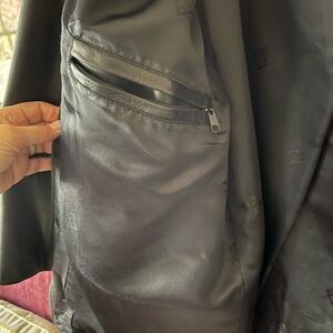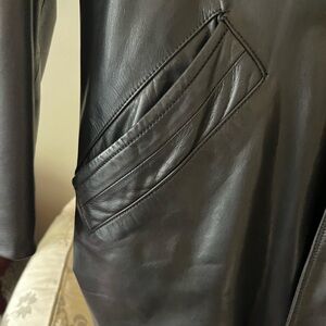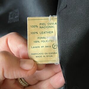 Men's black soft leather jacket with sleek button covered front zip and straight cut bottom. Two pockets with stitching detail in front, one upper left chest pocket with button and two interior zipper chest pockets. Made in Spain of 100% leather.