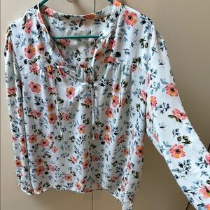 Chic floral blouse by LOFT. Perfect for spring! Features a beautiful mix of pink, orange, blue and green on a light blue background. Dress it up or down. Easy breezy style, wash and wear polyester. Size XL, easy generous fit. Please check out my other listings and make a bundle! I have lots of XL and Loft items!