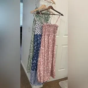 Set of three floral print maxi dresses. One in smocked pink and white (size extra small), tiered green and white (size extra small) and blue mixed block print maxi with adjustable straps (size 2P). Perfect for summer!!
