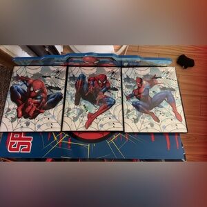 Set of three Spider-Man comic art panels. Features vibrant red and blue colors. 8x10 size with glass front plastic black frame smoke free home fast shipping