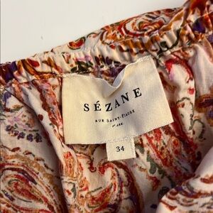 Stylish one-shoulder top with a vibrant paisley pattern. Features shades of orange and red.