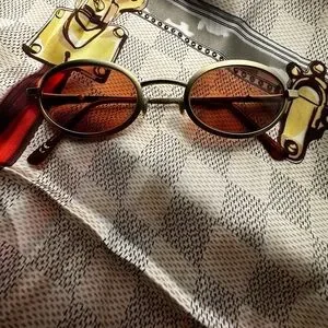 Vintage Serengeti 6415 Passport sunglasses feature a distinctively thick matte gold front frame and matching matte gold ear stems, a perfect color combination for the Serengeti mineral glass lenses. You'll note that this frame style has parallels with vintage Revo 1415 sunglasses, for during these years of the 1990s Revo and Serengeti sometimes shared frame designs but each used their own proprietary lens technology to go in them. The unisex Serengeti 6415 frame measures approximately 5.0" temple to temple, and the oval Serengeti lenses measure approximately 1.75" x 1.125" at the widest points with right lens laser etched with the stylized Serengeti S logo