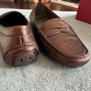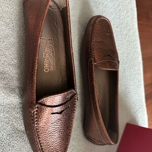 These are women’s Salvatore Ferragamo loafers / flats in shiny brown bronzed leather. Size 6.5 B. They are authentic, new, unused, and will ship with original dust bag and box. These are very comfortable!