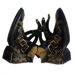 Step out in style with these Chloe chic black ankle boots, featuring elegant gold studs and three adjustable buckles Perfect for adding a touch of sophistication to any outfit.