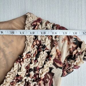 Channel timeless romance in this circa-2011 Mango midi: a deep V-neck framed by delicate ruffles, soft tan jersey scattered with painterly roses, and gathered waist ruching cinched by a chocolate ribbon belt for effortless garden-party elegance.