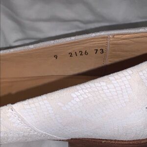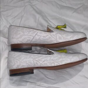 These Dieppa Restrepo loafers are a white suede with a snakeskin texture. They’re still in great condition. Note the one mark on the side in photos; the tassels are also a bit frayed. The soles were added professionally, so they wouldn’t be so slippery. They are a size 9 but fit like an 8.5.