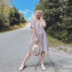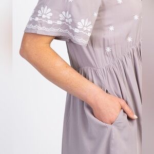 A solid hued peplum dress featuring embroidered floral details on the front and sleeves, a v-neckline and side pockets. Skirt is double lined to prevent sheerness.