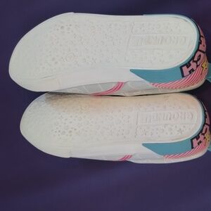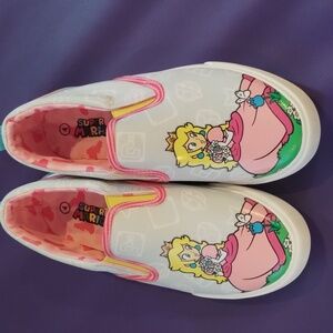Step into adventure with these Nintendo kids shoes. Featuring a playful pink and white design, these shoes are perfect for young fans. Comfortable and stylish, they bring fun to every step. Size 4 in kids. vans style but not vans brand. princess peach Mario cart. EUC.
