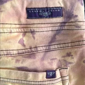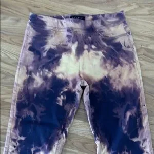 These leggings feature a vibrant tie-dye pattern in rich orange and purple hues, creating a unique and artistic look. Made from stretchy and form-fitting material, they offer comfort and style for any casual occasion. The cropped length adds a trendy touch to your outfit. Nice condition the rise is 13 inches the inseam is 31 inches elastic waist across is 19 inches