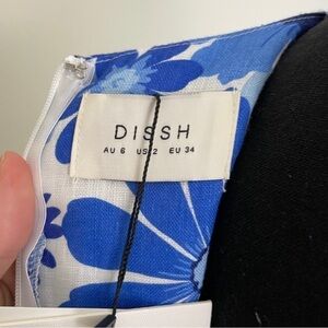 New with tags! Dissh Lori Bloom dress in blue floral print. 100% linen material 1 high neck dress is loose and flowy. Side pockets. US size 2. Maxi length.