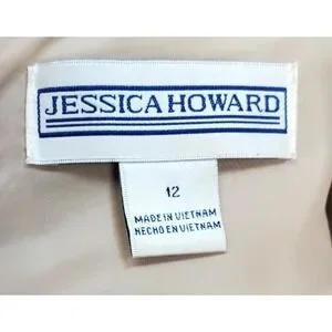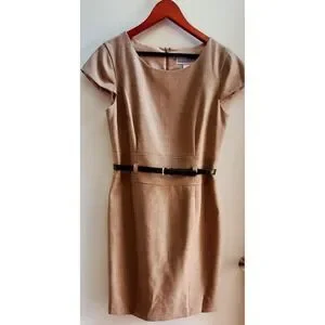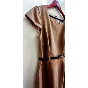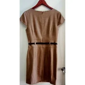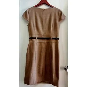 Jessica Howard Dress 12 Brown Belt Cap Sleeve Tweed Tan/Brown Sheath Poly Lined