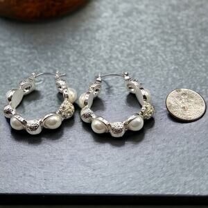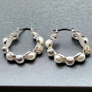 Enhance your elegance with our Pierced Hoop Earrings, featuring lustrous white simulated half pearls and shimmering rhinestones. Crafted for women in a sleek silver tone, these hoops offer a sophisticated blend of classic and modern styles, perfect for any occasion.
