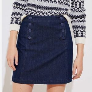 Blend of cotton, spandex, polyester. This Stylish denim skirt featuring a classic blue hue and chic button details. Perfect for dressing up or down.