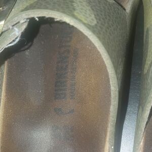 Experience comfort and style with Birkenstock women's sandals in a green camo shade. Perfect for everyday wear.