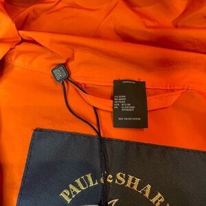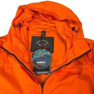 NWT Paul & Shark Save The Sea Sailing hooded Jacket in orange color. Sz M. Nylon/Elastane. Front zip closure. Long sleeves. Toggle-adjusting hood. Welt pockets. Zippered arm pocket.