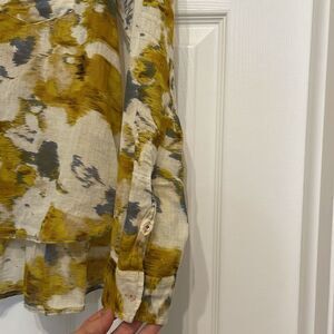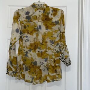 Anthropologie Holding Horses Watercolor Peplum Button Down Shirt, size 2. Excellent used condition. Very lightweight cotton. Adjustable sleeves. Front pocket. Peplum detail on back hem.