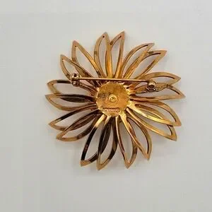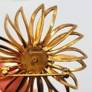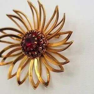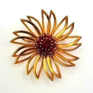 SARAH COVENTRY Gold Tone Flower Brooch Red Layered Rhinestone Center