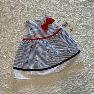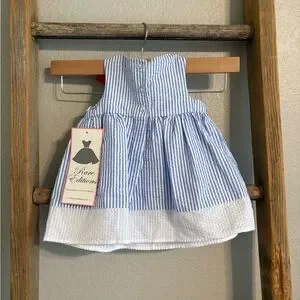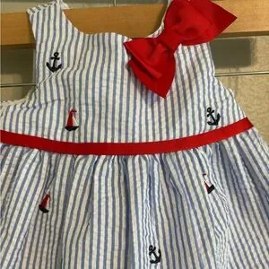 Blue and white seersucker dress with bloomers, little sailboat and anchor embroidery, and a little bow. Also comes with matching bloomers. This dress would be absolutely perfect for the Fourth of July or any time this summer!