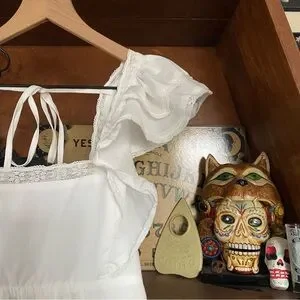 This elegant white dress features charming ruffle details, perfect for any occasion. Its classic design offers a timeless look.