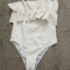 Stylish white one-piece swimsuit with ruffled top. Perfect for beach days. Worn but still in good shape. Straps not included. Smoke free home