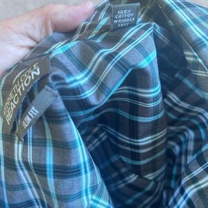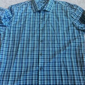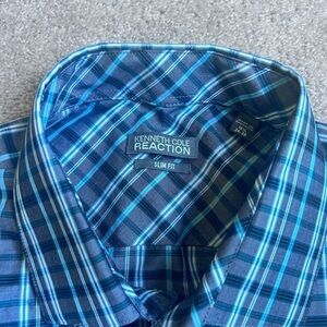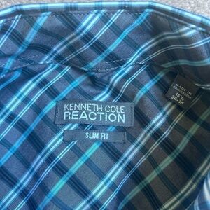 Kenneth Cole Dress Shirt Mens Blue Gray Plaid Non Iron Slim Fit Long Sleeve