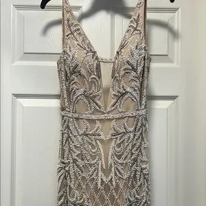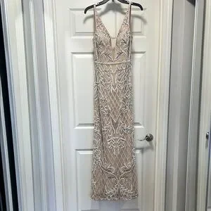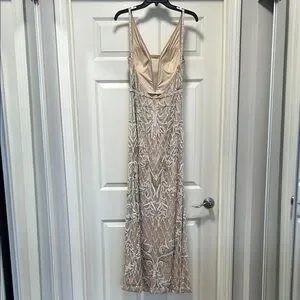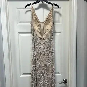 Anna C. Beige Embellished Beaded, Low Back Maxi Evening Dress, Gown, Worn once