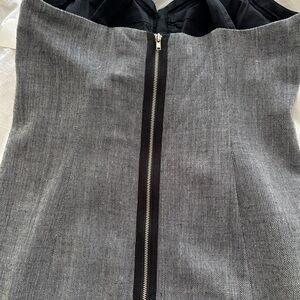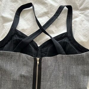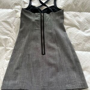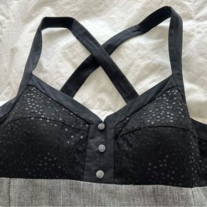 NWT black and grey fitted mini dress with cris cross straps, bra style sequined top, side pockets, back exposed zip closure. Buttons at front are decorative only. Approx 16” pit-pit and 34” length from top of strap. Juniors sizing.