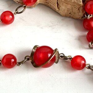 Art Deco Metal Wrapped Red Glass Bead Necklace 16" Vintage Jewelry
