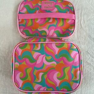 Vibrant cosmetic bag with a playful design. Features pink, orange, and green swirls. Perfect for travel or daily use. From the Mumu x Barbie collection.