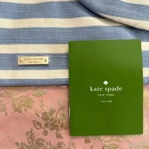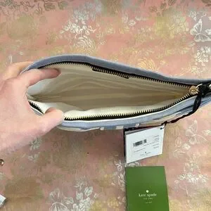 Elevate your style with this chic Kate Spade clutch. Featuring elegant blue and cream stripes, this bag is perfect for any occasion. The bow detail adds a touch of sophistication. Large enough to carry all of your essentials with a wrist strap for easy carrying. Brand new, never used, protective plastic covering still on the metal tag. 10.5” x 7”.
