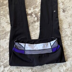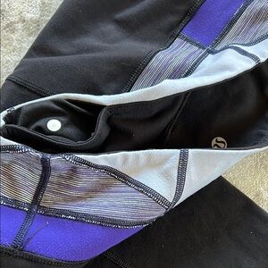 Stylish black leggings featuring a colorblock waistband in gray, purple, and blue. Perfect for workouts or casual wear.