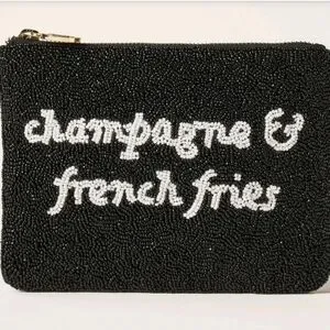 Stylish and chic, this Kate Spade black beaded clutch is perfect for any occasion. Featuring a playful 'champagne & french fries' design, it's a must-have accessory.
