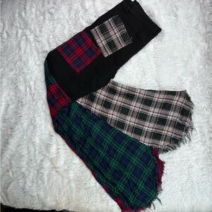 Brand new with tags, stretchy, black jeans with plaid patchwork flare bottoms. Features red, green, and black plaid patterns.