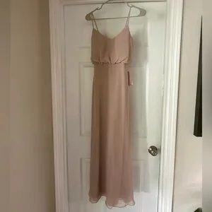 Birdy Grey XS taupe colored bridesmaid dress. Beautiful simple dress with POCKETS! The zipper is functional but it does get stuck and you have to pull it pretty hard to get it to zip up. Could be used as is or you could replace the zipper for more peace of mind. Comment with any questions!