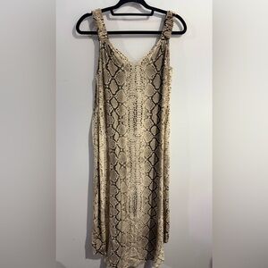 Python print unstructured draped slip dress with elastic straps, side seam pockets and a shirt tail hem.