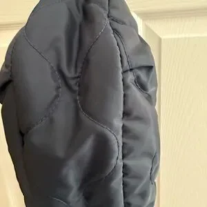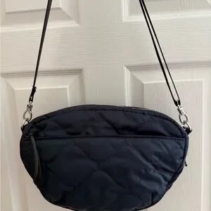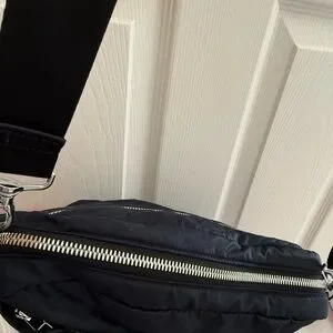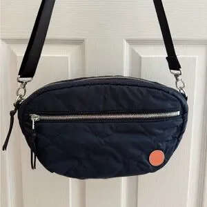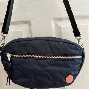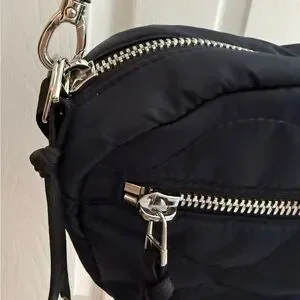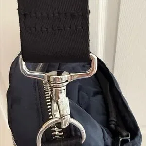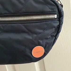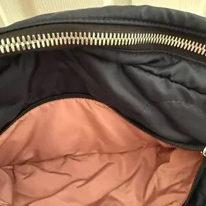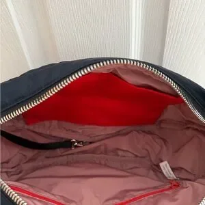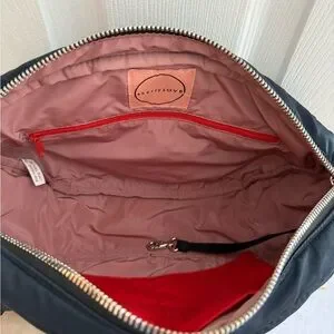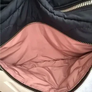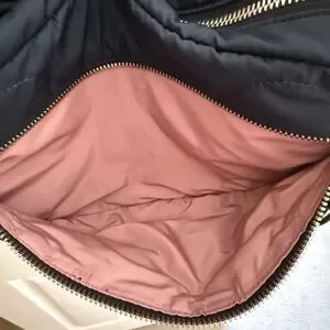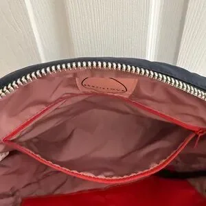 It has a zip top closure with an exterior zippered pocket on the front and back. It has a key leash and a beautiful blush interior.