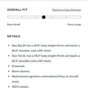 Size Tall 2L has a 35.5" body length (front and back), a 22.5" shoulder, and a 56" chest.