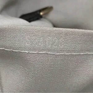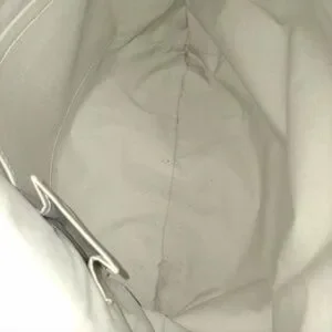 hardware, a detachable shoulder strap, and a trim of metalic grey leather, The top zipper opens to a beige fabric interior with a patch