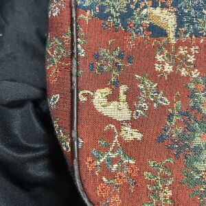 Charming tapestry crossbody bag with intricate design. Features a rich blend of colors. Tapestry crossbody or shoulder purse with quilted interior; see pics for measurements, details, & wear; minimal wear visible on piping in pics; beautiful & unique accessory!